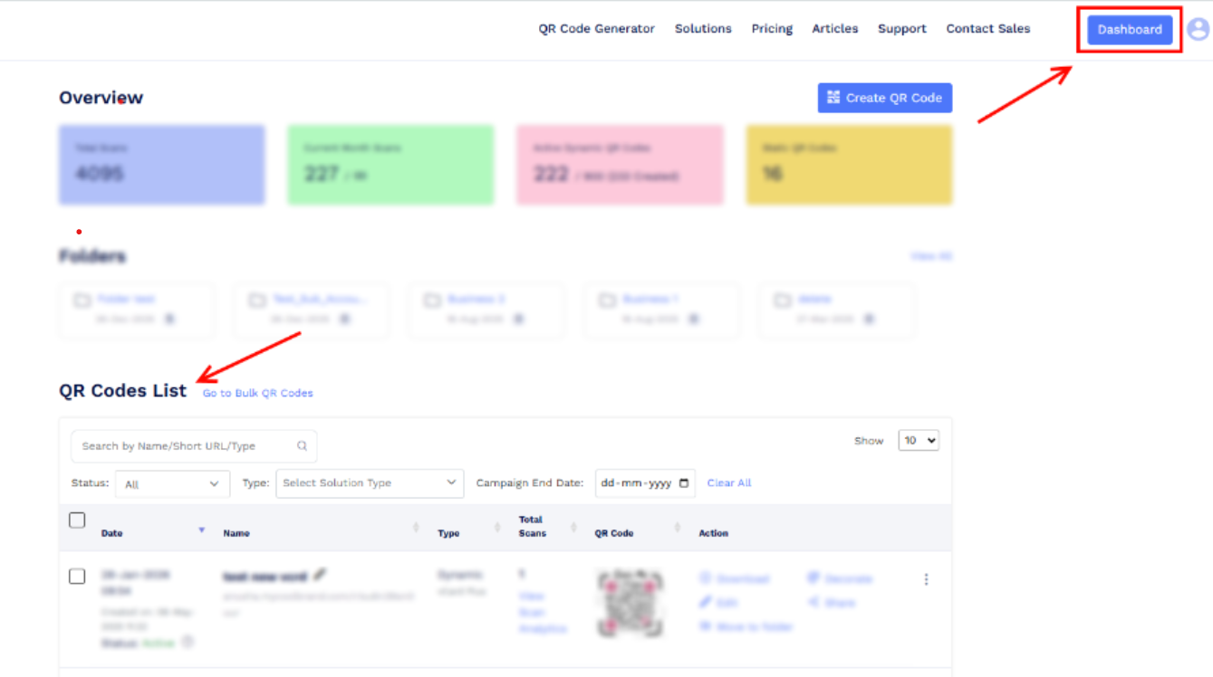 All the QR codes you create are stored in your Dashboard. To view them, log in to your QRCodeChimp account and open the Dashboard, where you’ll find a list of your saved QR codes.
