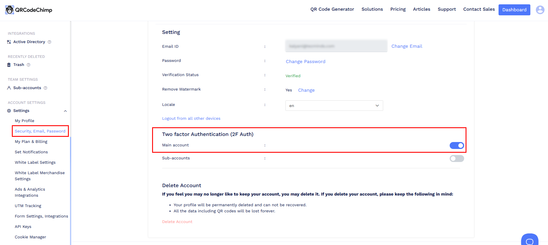 Under the Two Factor Authentication (2F Auth) section, enable the option for the main account.