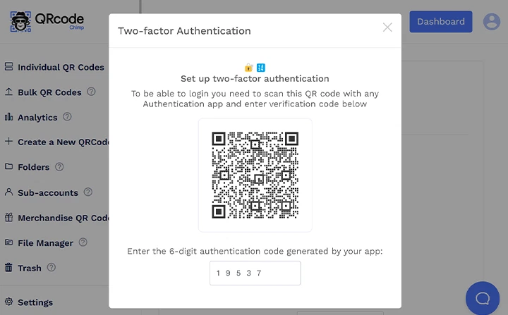 Open your authenticator app, scan the QR code shown in the pop-up, and enter the generated verification code in the input box.