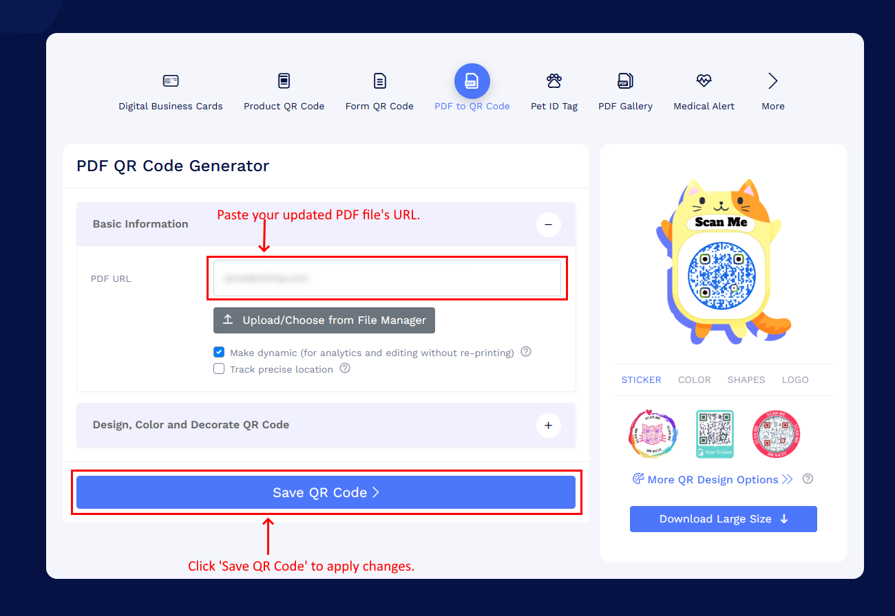 If your PDF QR code is linked to an external file (like from Google Drive or Dropbox), you can update it by replacing the old shareable link with the new one.
