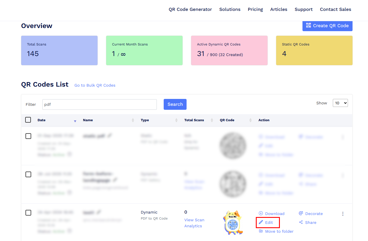 - Go to your Dashboard and click the Edit icon on your existing PDF QR code.