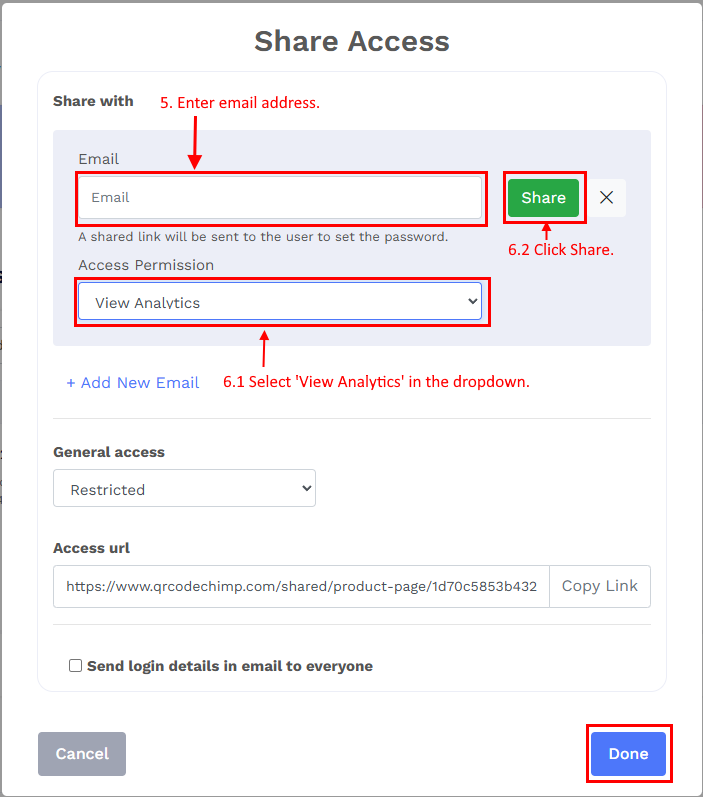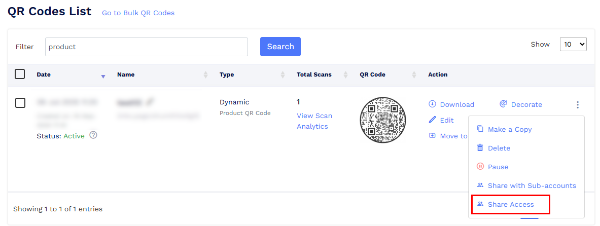 You can share Product QR analytics securely using the Share Access feature. This allows your teammate or client to view analytics and form responses for a specific Product QR code without giving access to your entire account.
