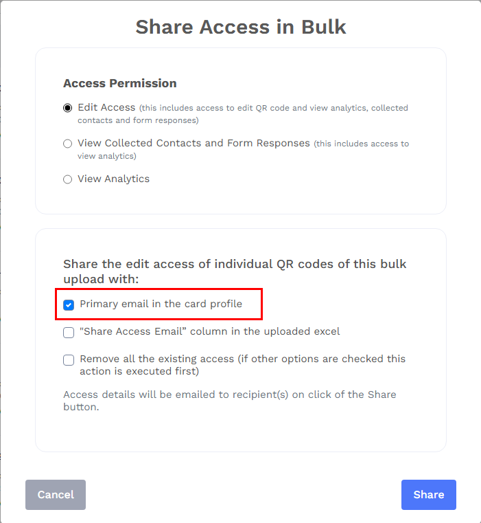 When you share access to bulk digital business cards and choose “Primary Email in Card Profile,” the system uses the email address appearing in the Contact Us or Profile section of the digital business card to share access.