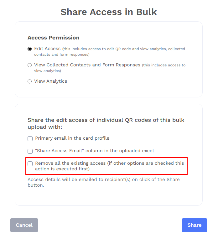 This ensures that only the newly shared users retain access to the bulk QR codes, and no previous access remains active.