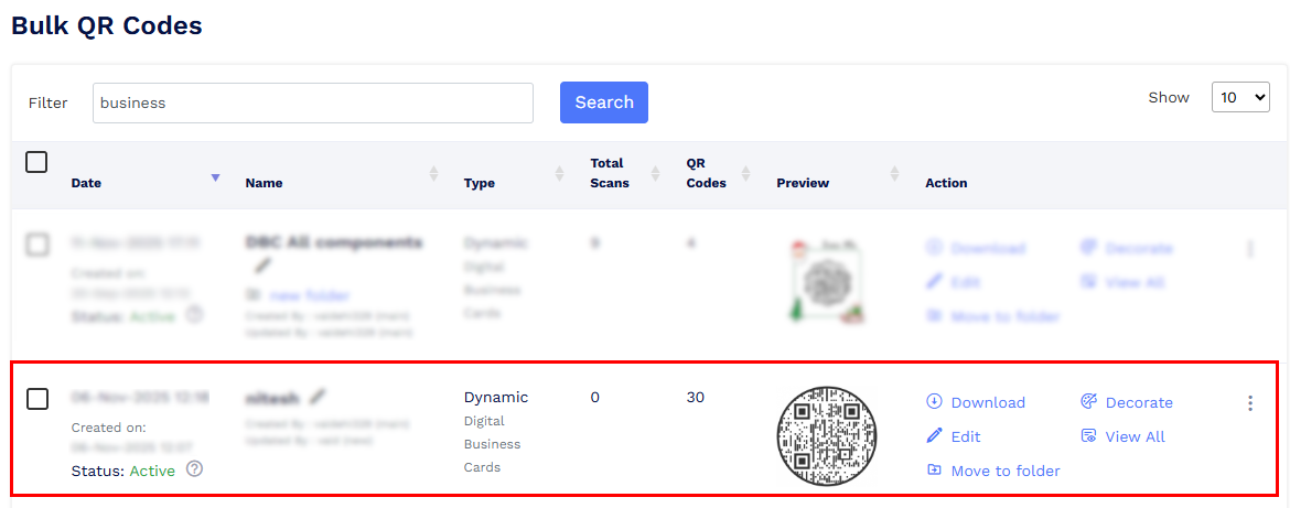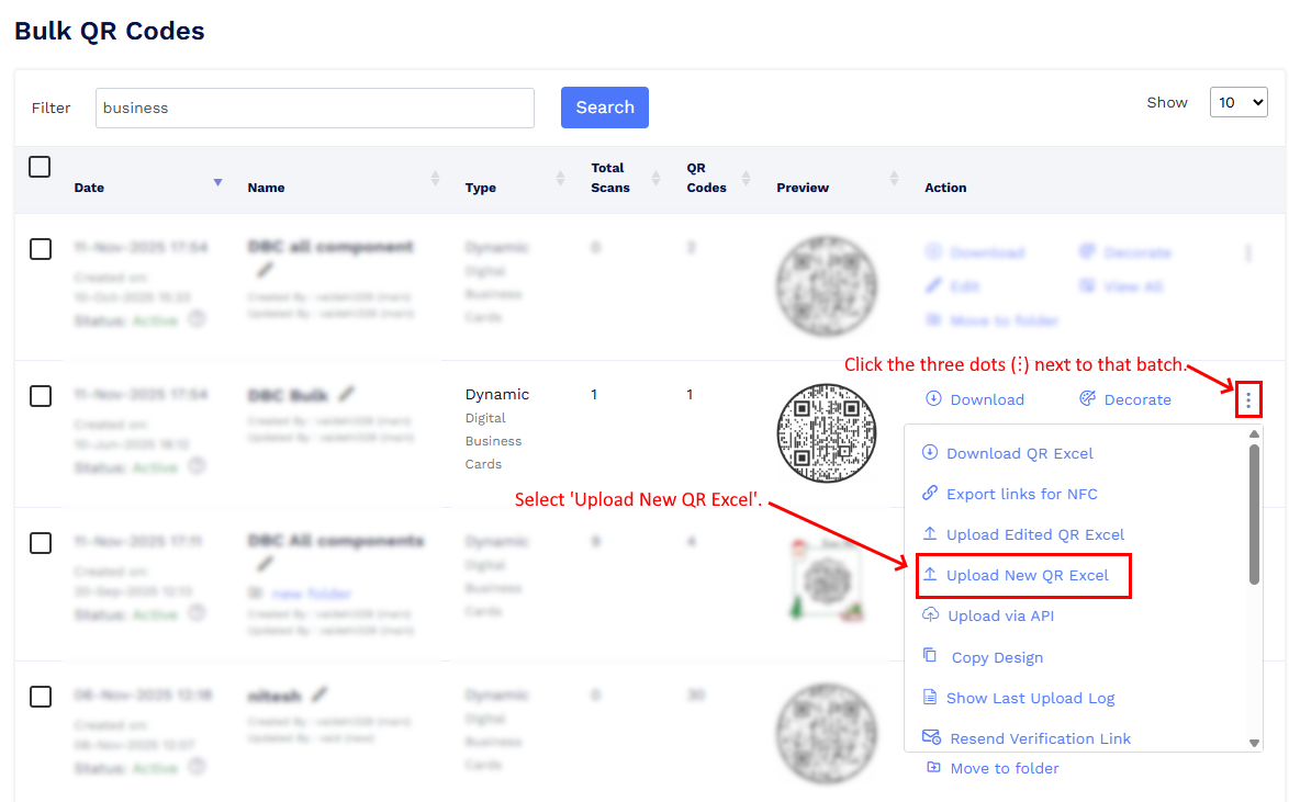 Click the three dots (⋮) next to that batch and select Upload New QR Excel.