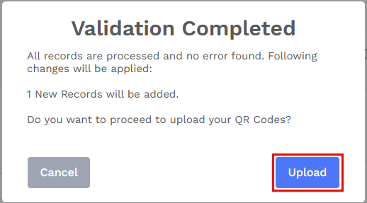 After successful validation, click Upload to start processing. Adding new records may take some time, depending on the file size.