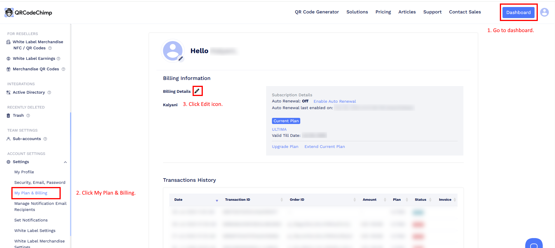 In the Billing Details section, click the Edit icon and update your billing name and address.