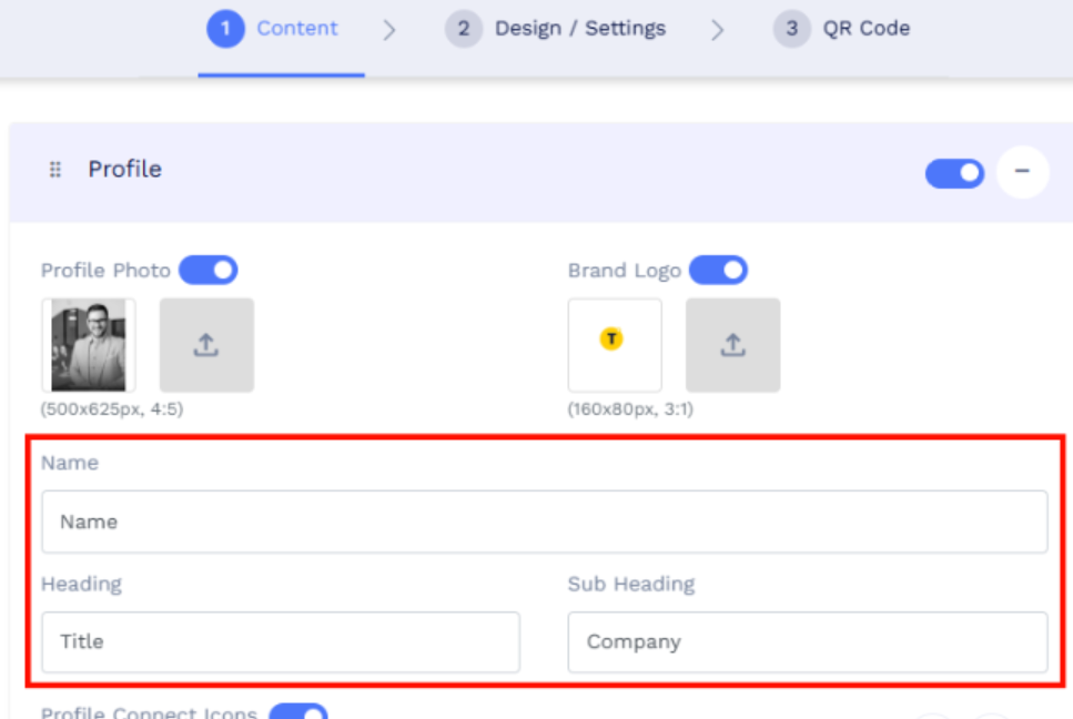 - Enter a Name and a Subheading in the Profile section.