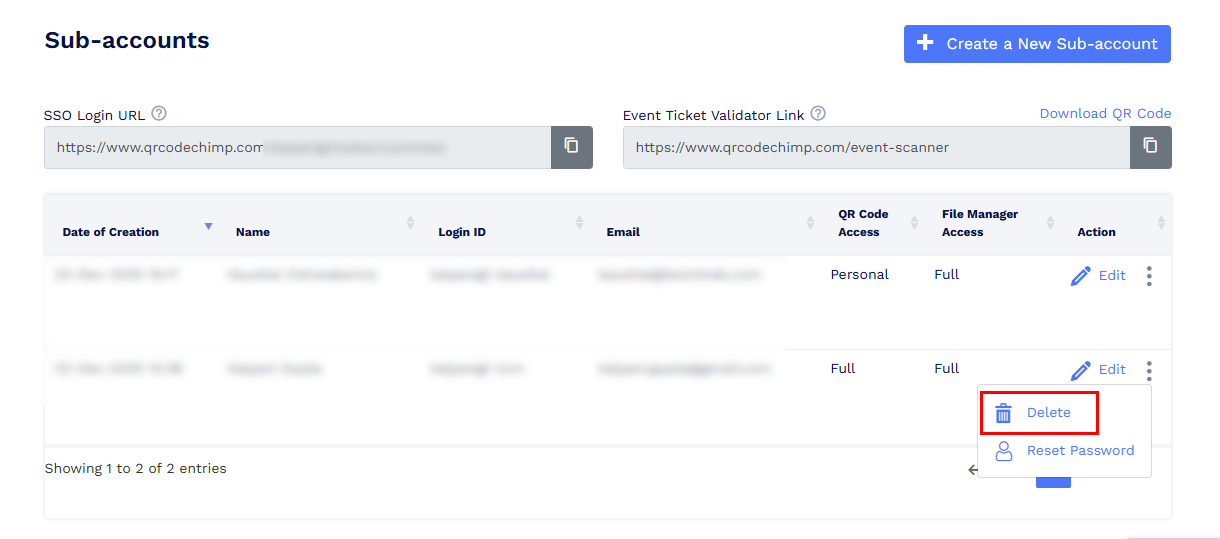 Once deleted, the sub-account will be removed. The QR codes created and files uploaded by the sub-account will remain in the main account.