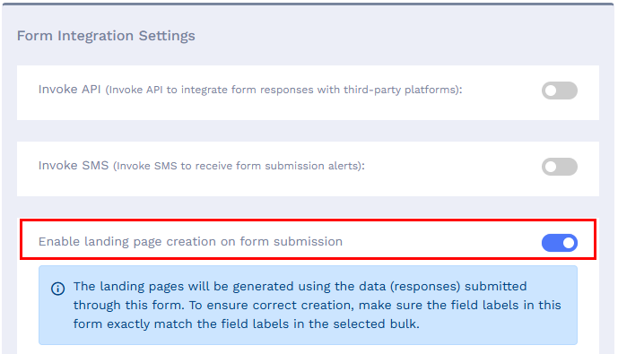 Field mapping becomes relevant when the Enable landing page creation on form submission option is enabled in Form Integration Settings.