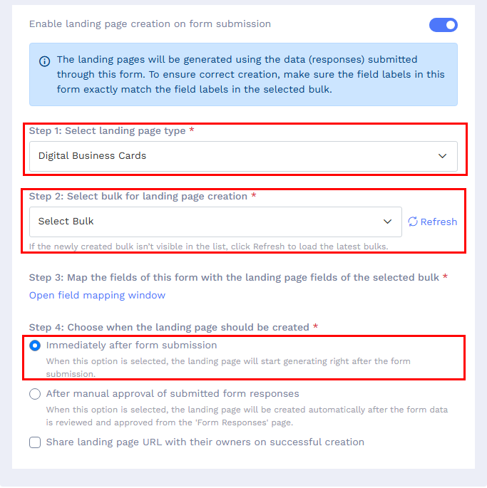 Once configured, the landing page is created automatically as soon as a form response is submitted, without requiring manual approval.