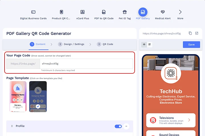 In Your Page Code, enter a unique page code (this becomes part of the page URL). Page code can not be edited once the QR code is saved.