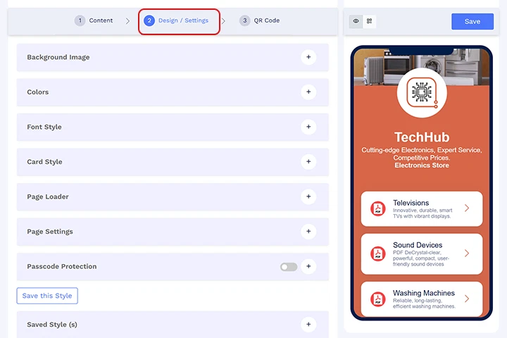 Click the Design/Settings tab to customize the page design. Here, you can update the background image, colors, font styles, and other visual elements of your PDF gallery page (optional).