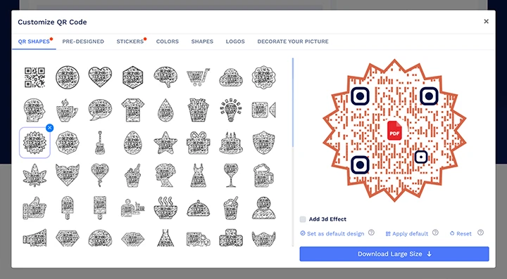 Open the QR Code tab to customize the QR code design. You can change the QR code shape, colors, and add a sticker or logo if required (optional).