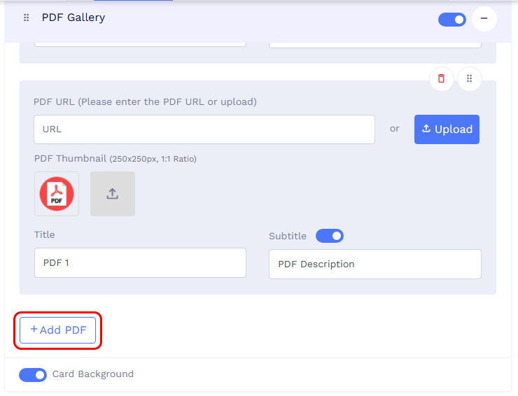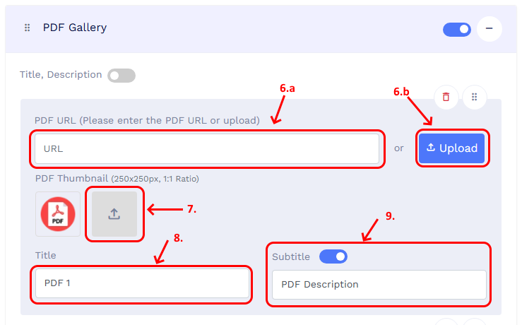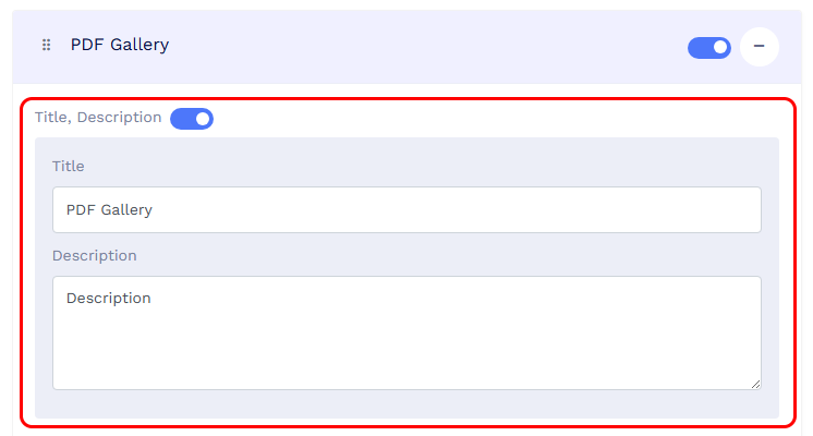 Enable the Title and Description toggles if you want to display additional information at the top of the PDF gallery section.