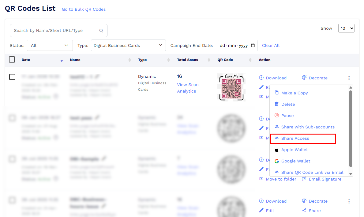 The Share Access feature allows you to give team members or clients controlled access to specific QR codes without sharing your account login details.