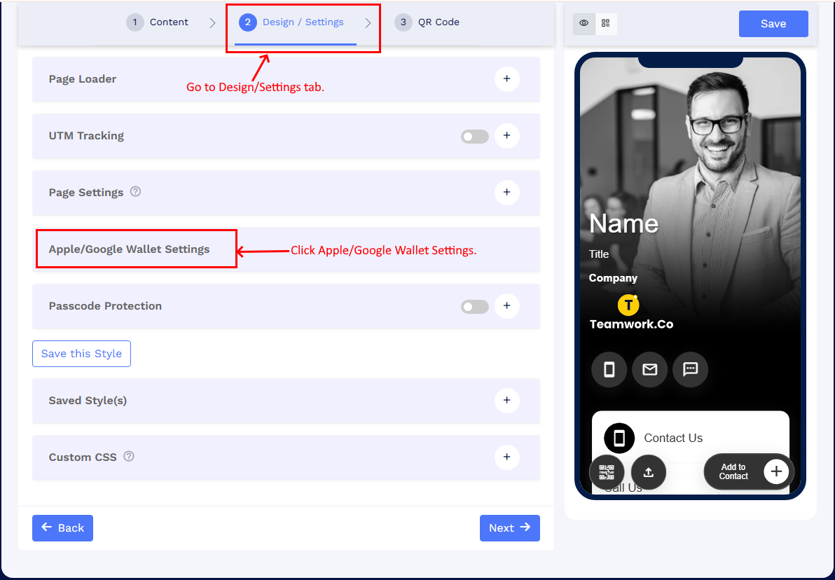 Click 'Save' to apply changes. - Click Reset to restore the default wallet colors based on your selected digital business card template.