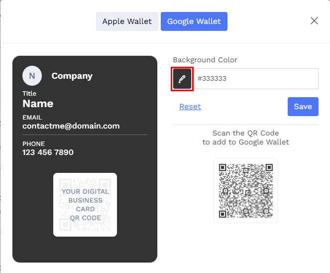 - If the Google Wallet pass has already been added, the changes will not update automatically. To apply the updated colors, save the digital business card to Google Wallet again and replace the existing pass.
