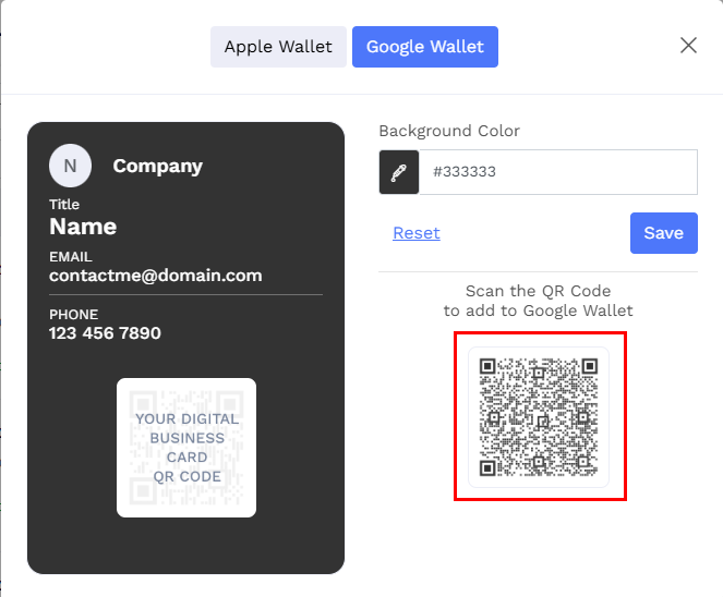After saving, scan the QR code shown in the pop-up using your Android device and add the digital business card to Google Wallet with the updated background color.