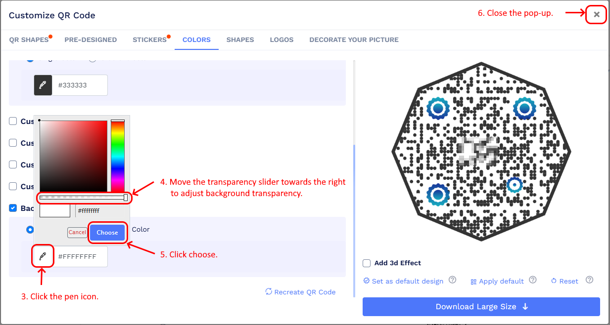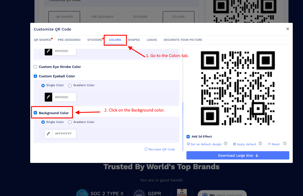 - Go to the COLORS tab on the Customize QR Code pop-up.
