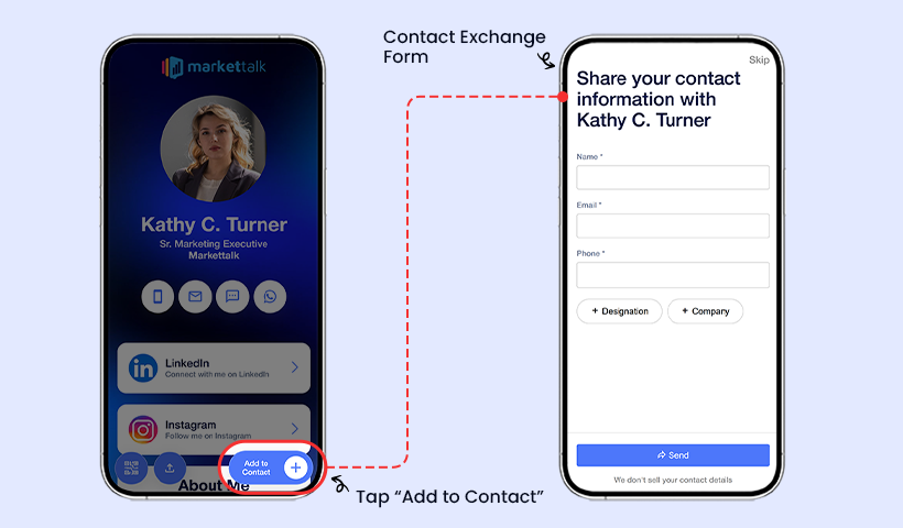 Contact exchange form is shown when users click the Add to Contact button. - Once submitted, their contact information is shared with you